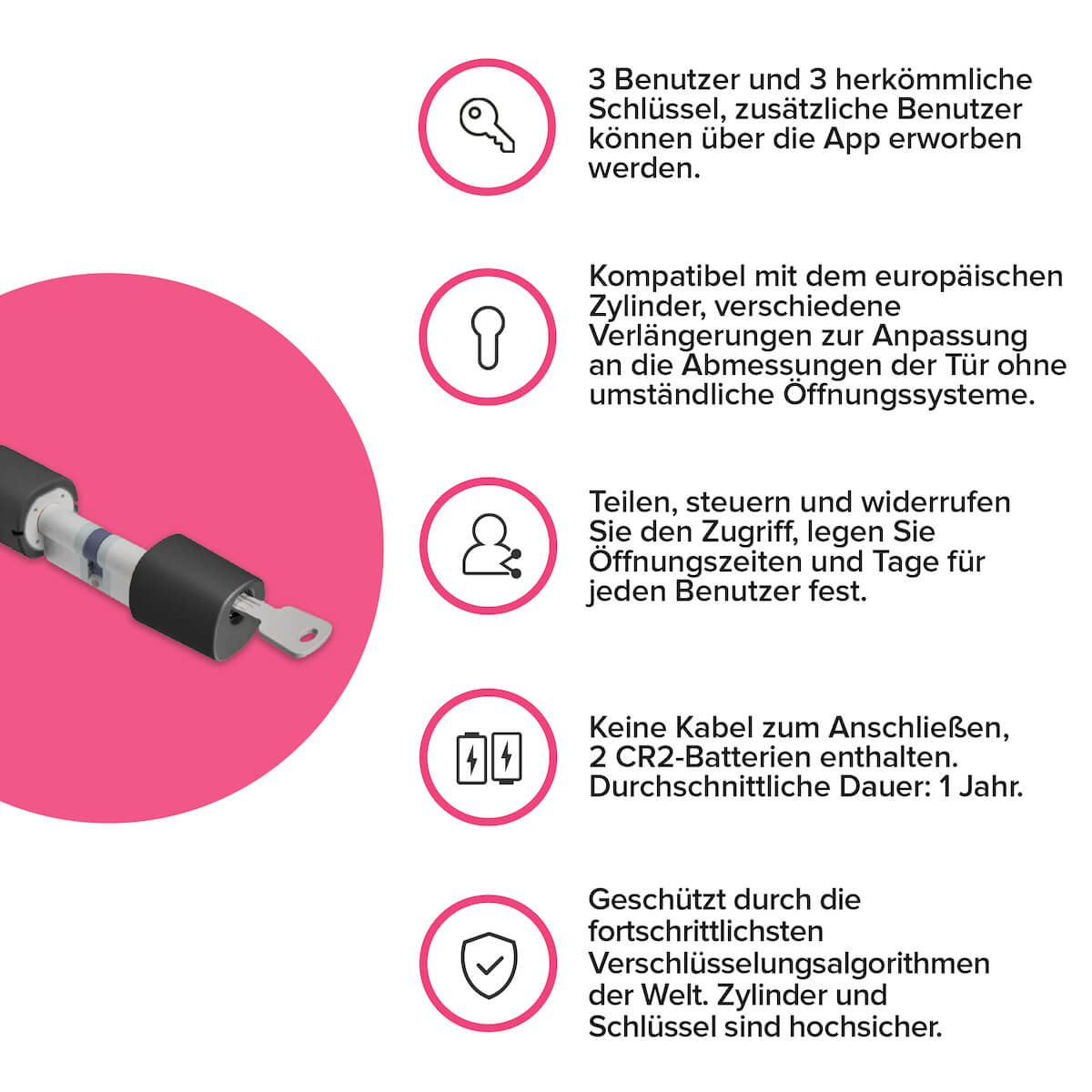DORY ist mit dem europäischen Standard-Schließzylinder kompatibel. Es sind verschiedene Längen passend für jede Tür erhältlich.