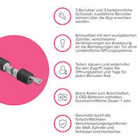 Die Freigabe und der Entzug des Zugangs, mit möglichen Einschränkungen an bestimmten Wochentagen / Zeitfenstern, macht die Nutzung intelligenter und unterscheidet sich stark vom traditionellen Schlüssel. Außerdem können Sie mit dem LINK-Zubehör die Öffnung auch aus der Ferne oder mit einem einfachen Sprachbefehl steuern!