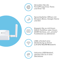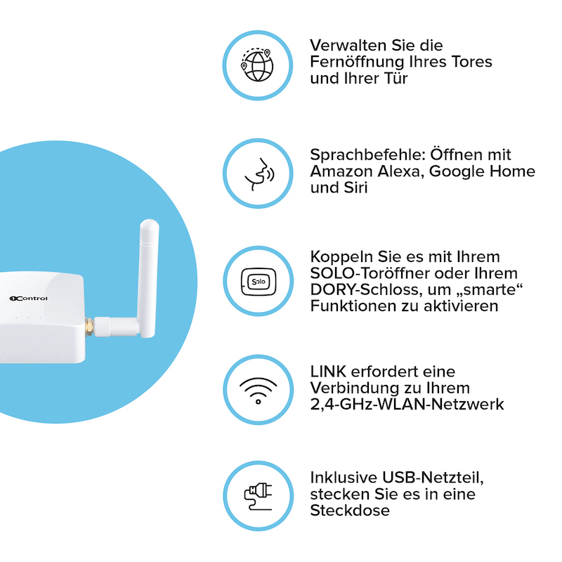 Dank der Wi-Fi-Verbindung ermöglicht LINK das Fernöffnen sowohl des SOLO-Toröffners als auch des DORY-Schlosses und des LOCO-Vorhängeschlosses.