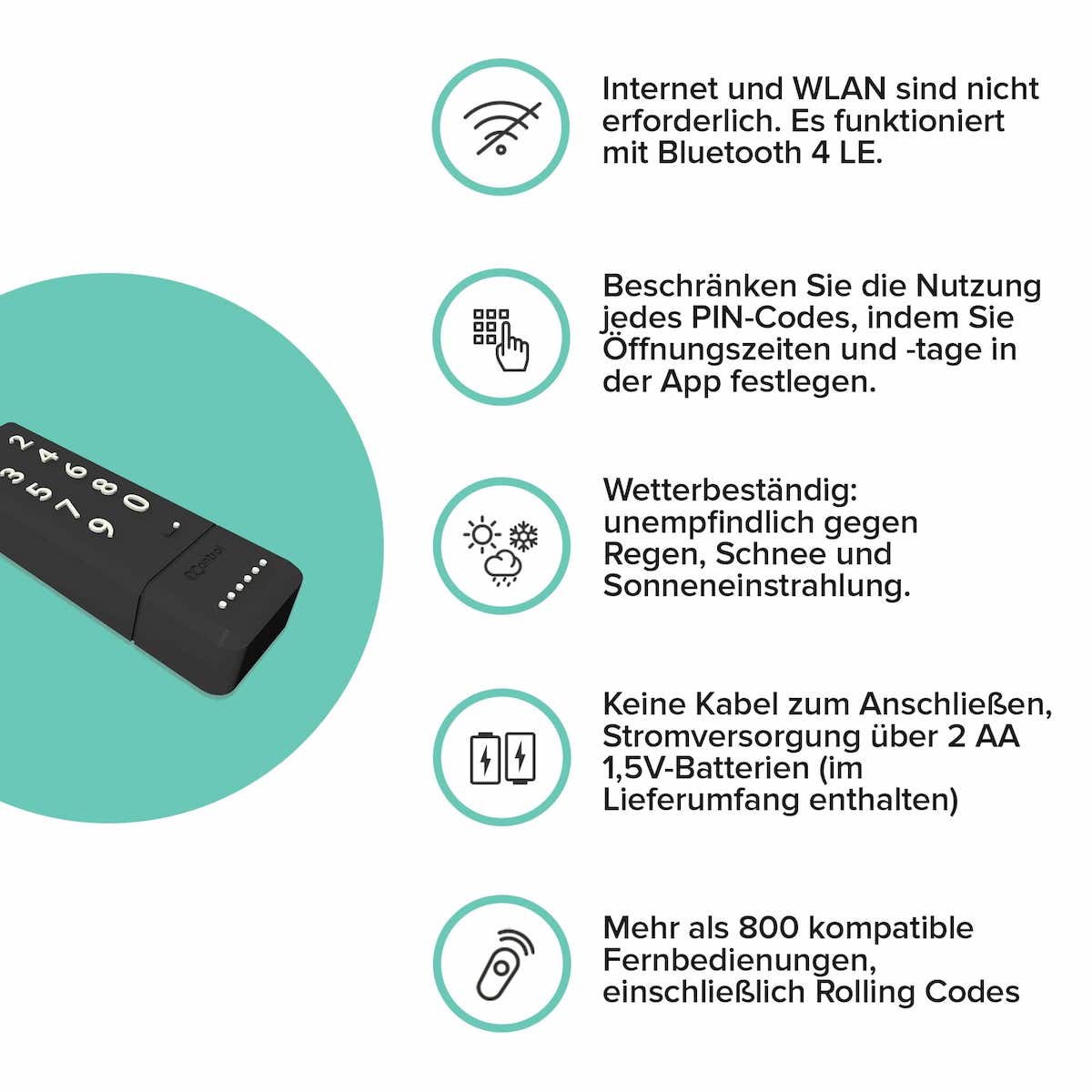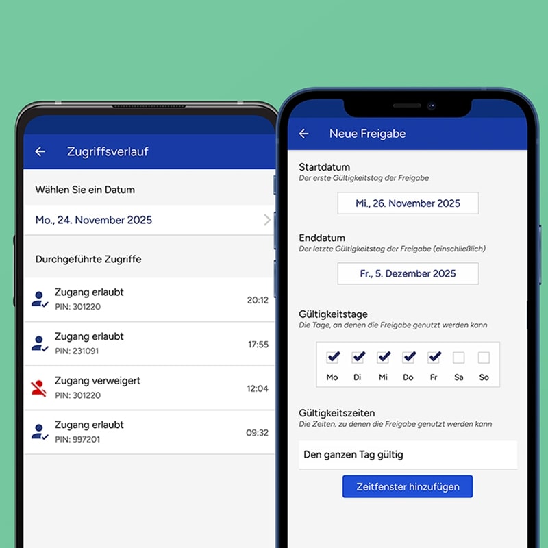 Öffnen Sie Tor und Garage mit einem PIN-Code. Sie können jeden PIN zudem einschränken, indem Sie gültige Tage/Zeiten festlegen.