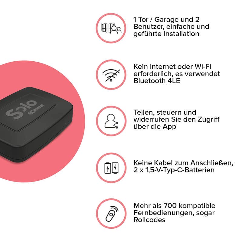 SOLO MINI ist der Toröffner, mit dem Sie das Tor und die Garage mit Ihrem Smartphone öffnen können. Es ist das einzige weltweit ohne Kabel und mit einer so breiten Kompatibilität.