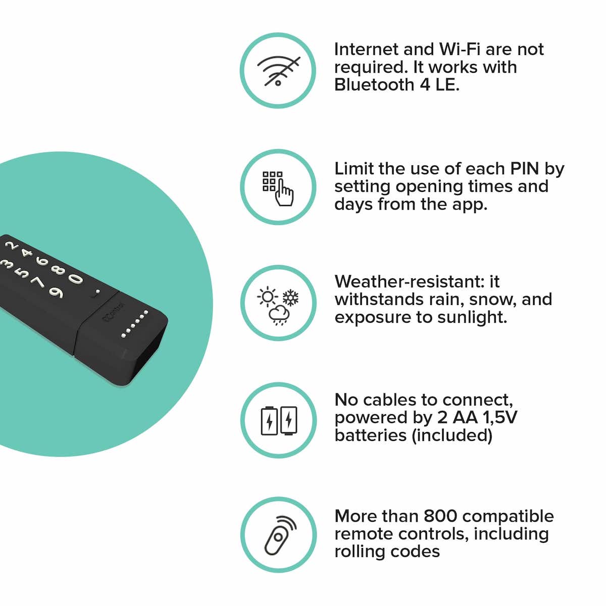 • 4 PIN codes included, with the possibility to set days/times of use
