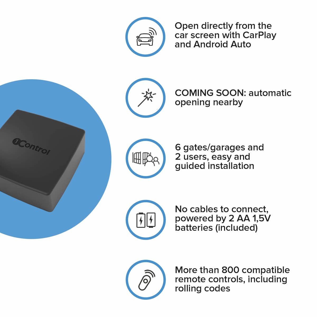 • Controls 6 gates/garages and 2 users