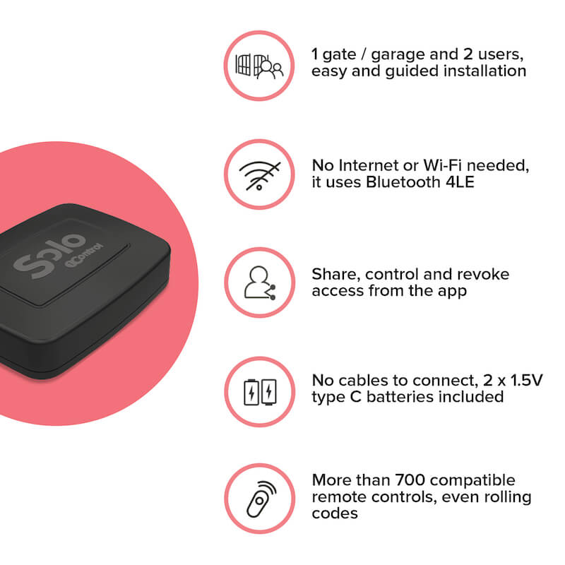 Furthermore, the communication between smartphone and SOLO is protected by the latest security algorithms, while the communication between SOLO and the gate uses the same security as the original remote control.