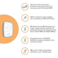 The 1Control WHY universal remote controls manage up to 4 access points and copy over 750 rolling code and fixed code remotes, from 433.0 to 868.0 MHz, including those from different brands (like Hörmann BiSecur).