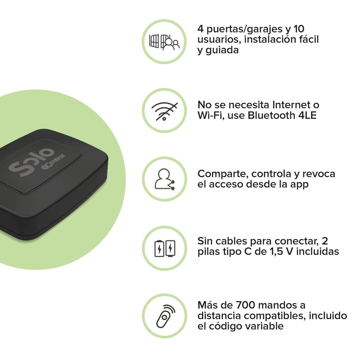 SOLO es el abrepuertas que le permite abrir la puerta y el garaje con su teléfono inteligente. Es el único en el mundo sin cables para conectar y con tan amplia compatibilidad.