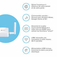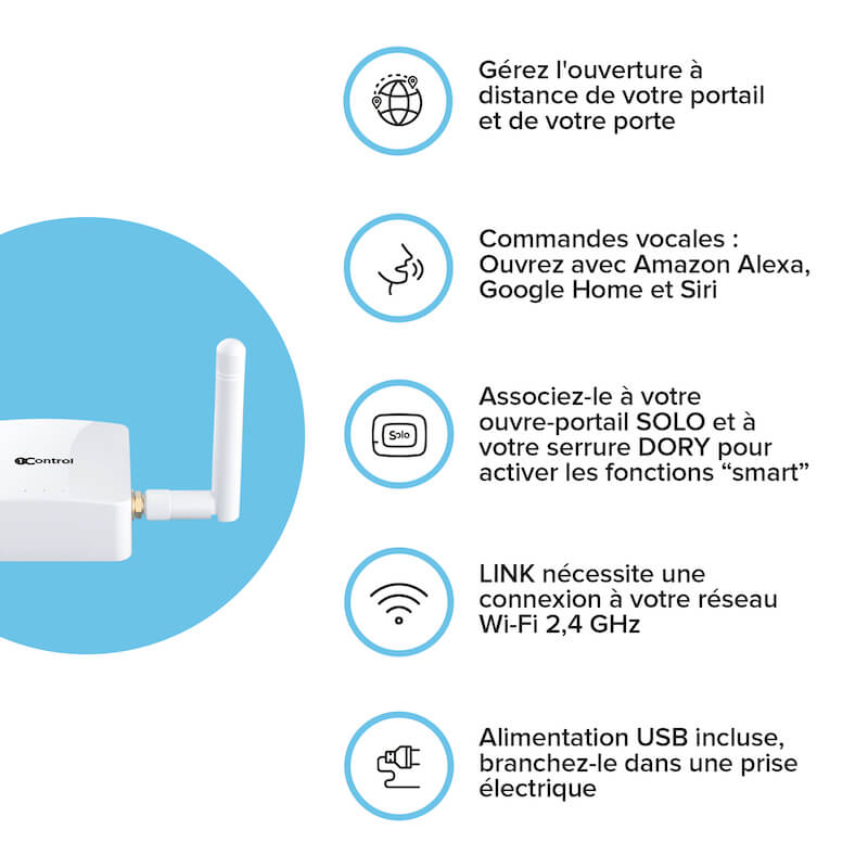 LINK, grâce à la connexion Wi-Fi, permet l'ouverture à distance de l'ouvre-portail SOLO, de la serrure DORY et du cadenas LOCO.
