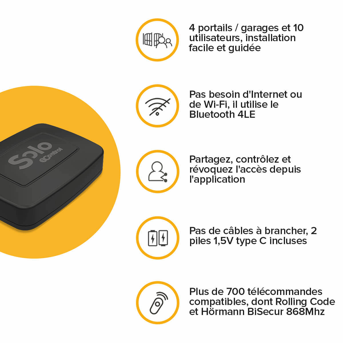 De plus, la communication entre le smartphone et SOLO est protégée par les derniers algorithmes de sécurité, tandis que la communication entre SOLO et le portail utilise la même sécurité que la télécommande d'origine.