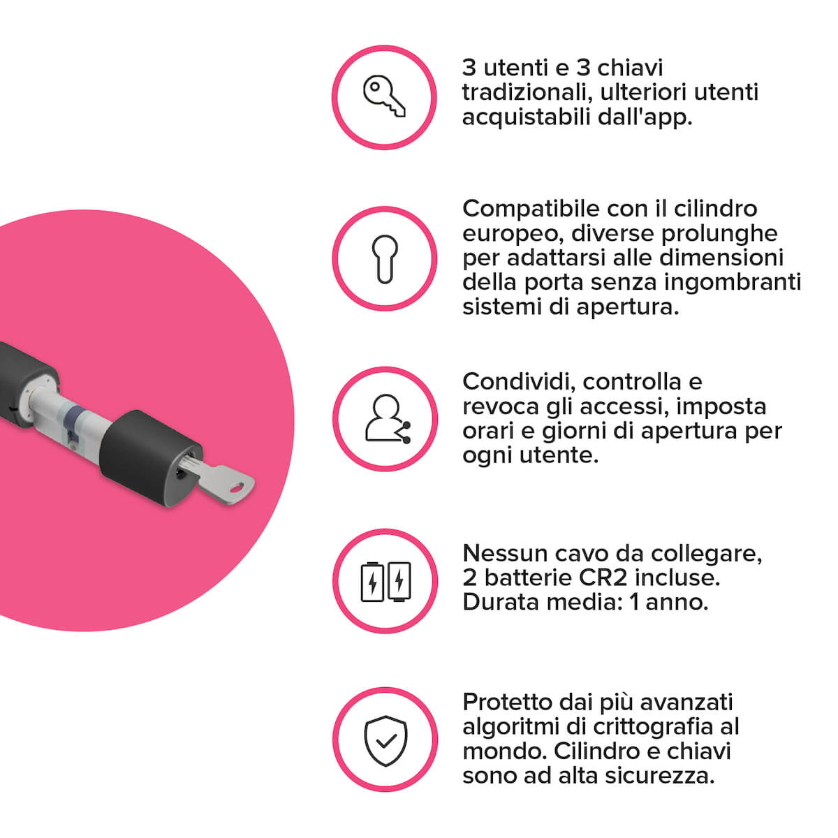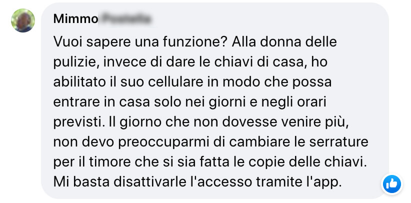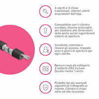 La condivisione e revoca degli accessi, con eventuali limitazioni in determinati giorni della settimana/fasce orarie, rende l'utilizzo più smart e molto diverso dalla chiave tradizionale. Inoltre con l'accessorio LINK puoi gestire l'apertura anche da remoto o con un semplice comando vocale!