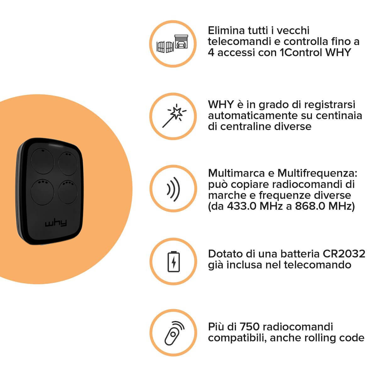 1Control WHY è il telecomando universale che permette di controllare fino a 4 diversi accessi (es. cancello, garage, cancello ufficio, ingresso seconda casa). Con WHY puoi dimenticarti per sempre di tutti i tuoi vecchi telecomandi.