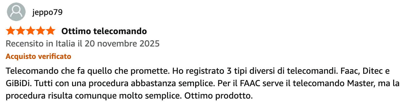 Può copiare più di 750 radiocomandi rolling code e codifica fissa, da 433.0 MHz a 868.0 MHz anche di marche diverse.